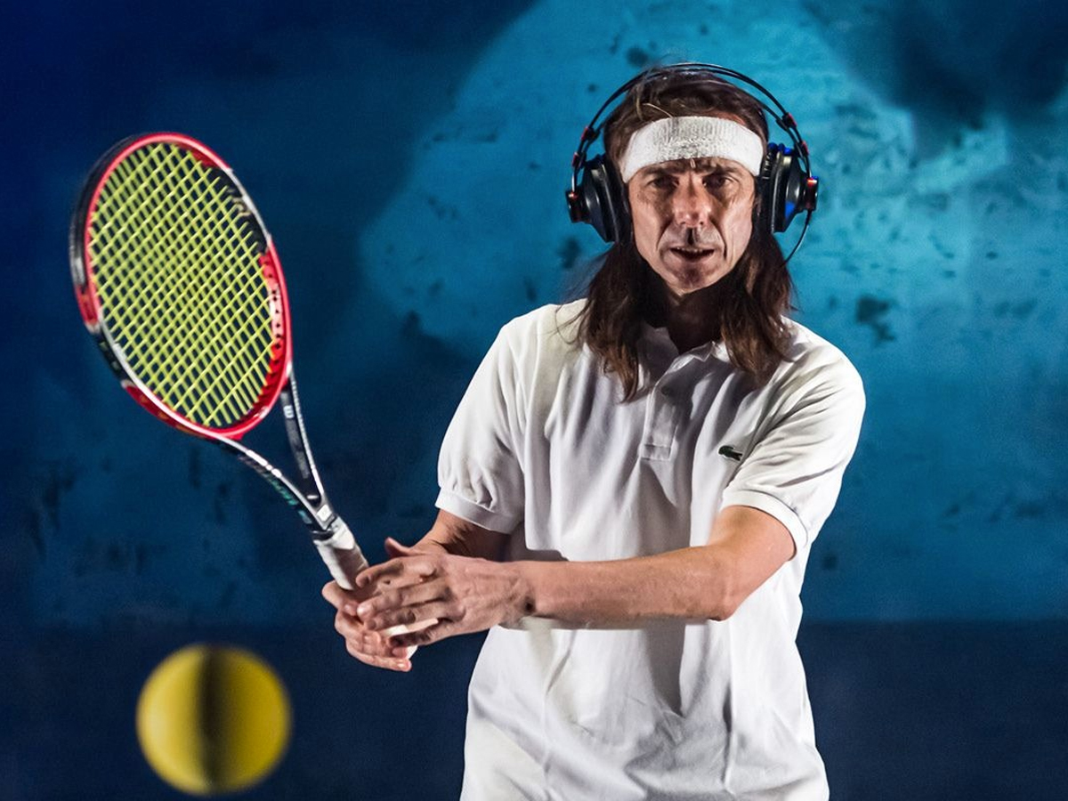 Con la cuffia, in abbigliamento agonistico, davanti al muro di plexiglass. Le corde fosforescenti della racchettacolpiscono 875 volte la pallina. Così per quasi un’ora va in scena uno spettacolo originale, non solo con la “quartaparete” ma soprattutto nell’epoca post-covid.