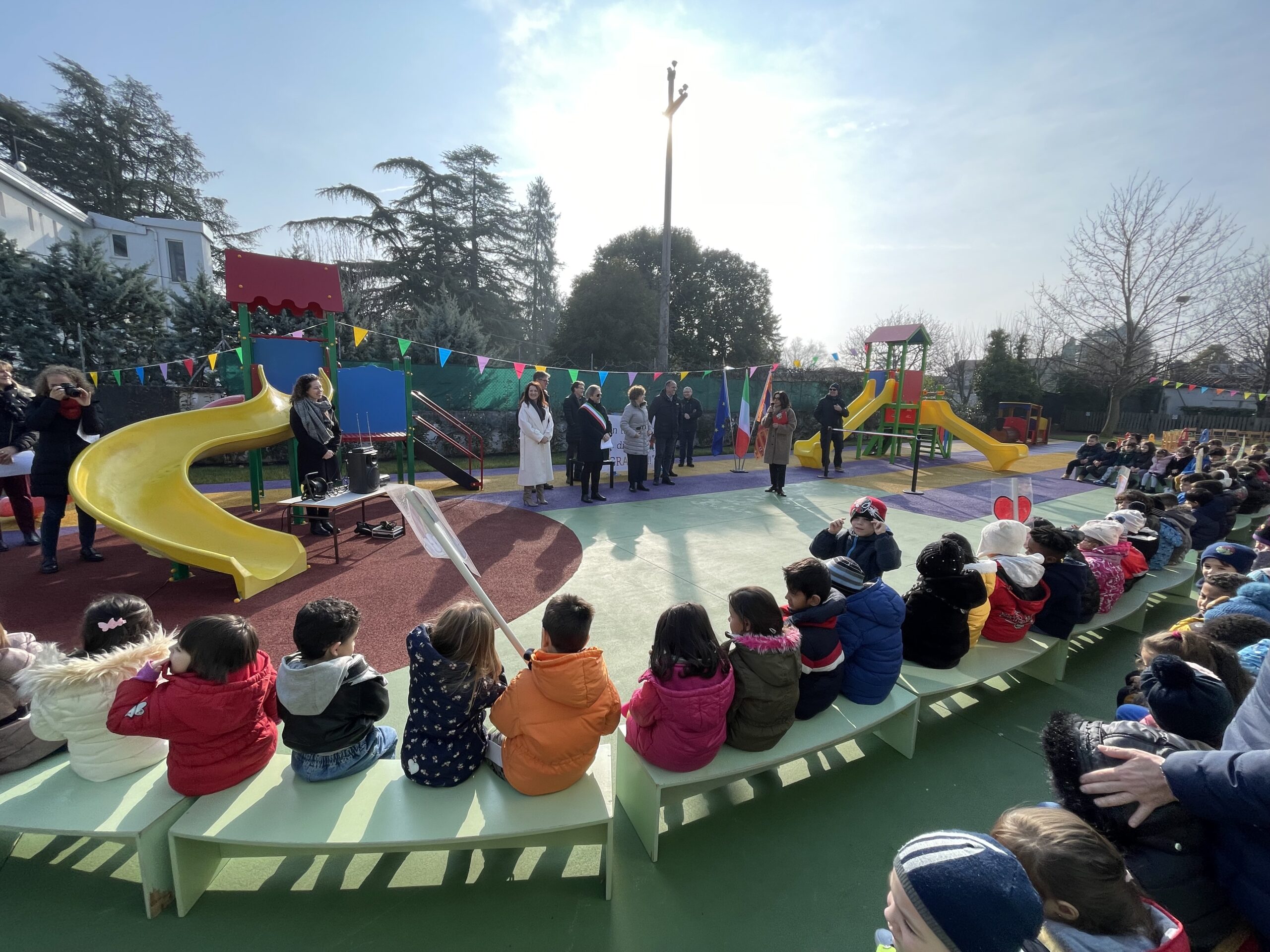 Inaugurata la nuova area giochi della statale Amatori, un investimento dal 135 mila euro che migliora la vita di bambini e maestre. Ma la demografia impone scelte importanti. il sindaco Michelusi: nelle scuole dell'infanzia della città ci sono ben 172 posti vuoti. Per le primarie si pensa a un'unica nuova scuola che unisca le attuali cinque che necessiterebbero di sette milioni di euro di interventi strutturali.