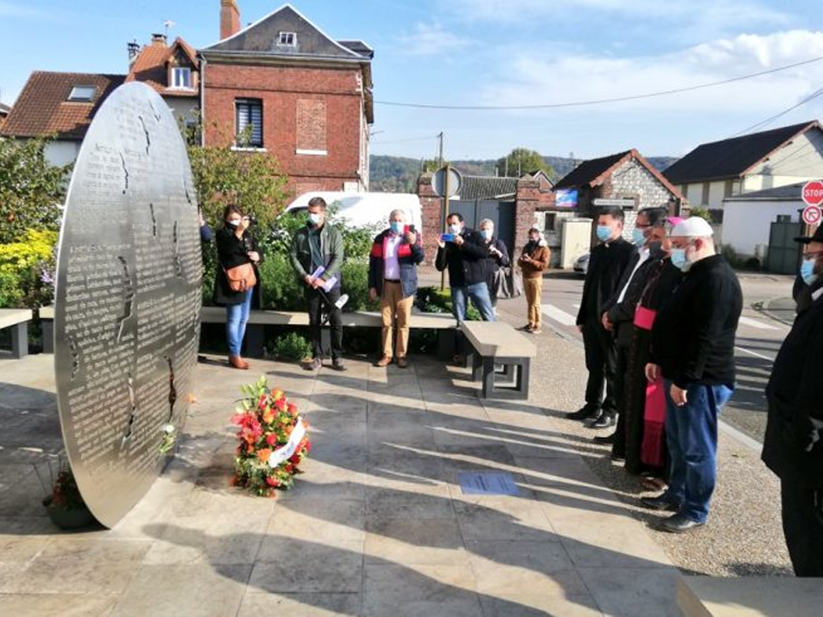 Un lungo minuto di silenzio davanti alla “Stele per la fraternità” eretta accanto alla chiesa di Saint-Étienne-du-Rouvray, a Rouen, in memoria di padre Jacques Hamel, il sacerdote barbaramente sgozzato 4 anni fa, il 26 luglio 2016, da due giovani estremisti.