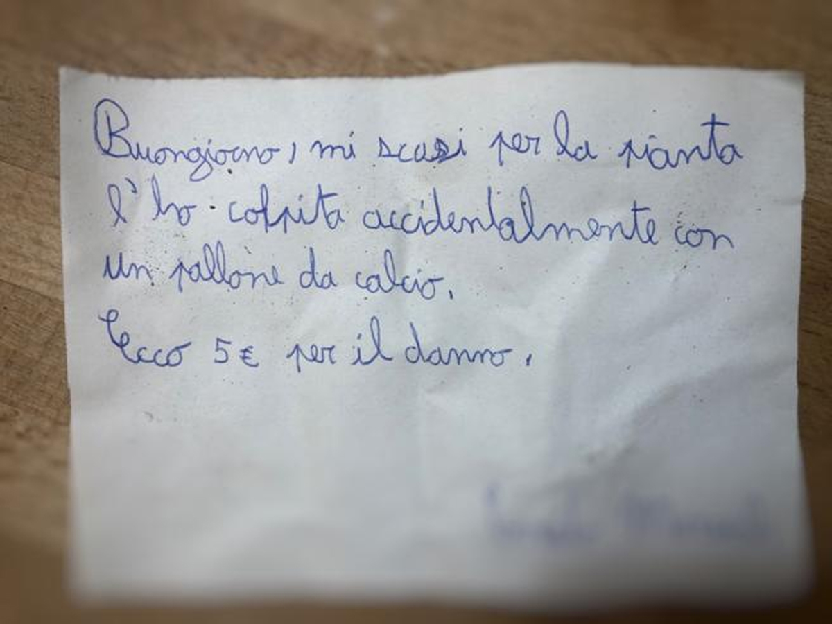 Un ragazzo di 11 anni con una pallonata colpisce il vaso e danneggia la pianta del vicino di casa. Non scappa, sente il dovere di lasciare un biglietto.