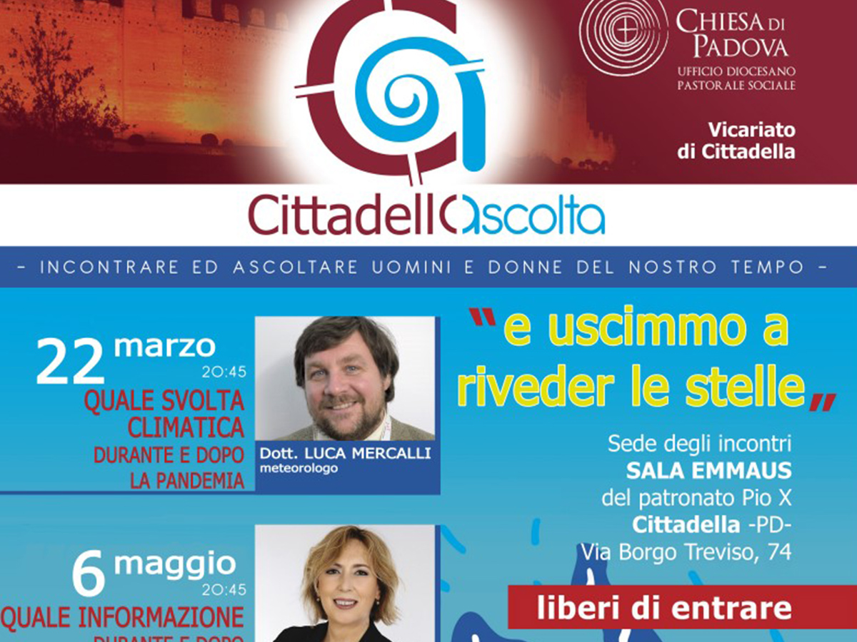 Il Coordinamento Pastorale Vicariale, su iniziativa dell’Ufficio Pastorale della Diocesi di Padova, propone alla Comunità cittadellese il progetto Cittadellascolta 2022. Il tema che viene presentato è: e uscimmo a riveder le stelle. La pandemia ha limitato il nostro vivere e ha posto di fronte alla necessità di ripensare a parole il cui significato sembrava assodato: malattia, salute, libertà, costrizione, dittatura, solidarietà.
