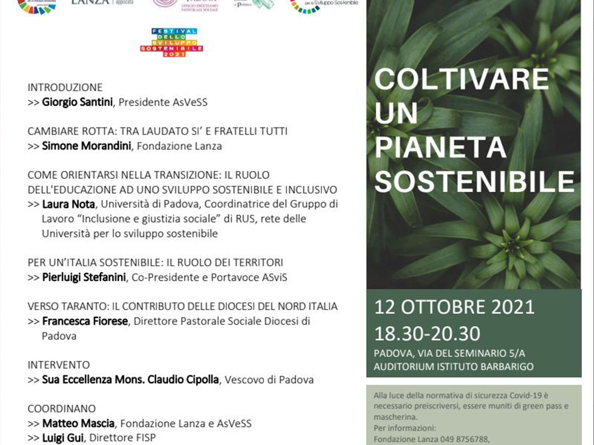 All’interno del Festival dello sviluppo sostenibile 2021, organizzato da ASviS, Alleanza Italiana per lo Sviluppo Sostenibile (ASviS), si colloca l’appuntamento organizzato da Fondazione Lanza, centro studi in etica applicata, Ufficio di Pastorale sociale e del lavoro della Diocesi di Padova e Fisp-Scuola di formazione all’impegno sociale e politico, domani, martedì 12 ottobre.