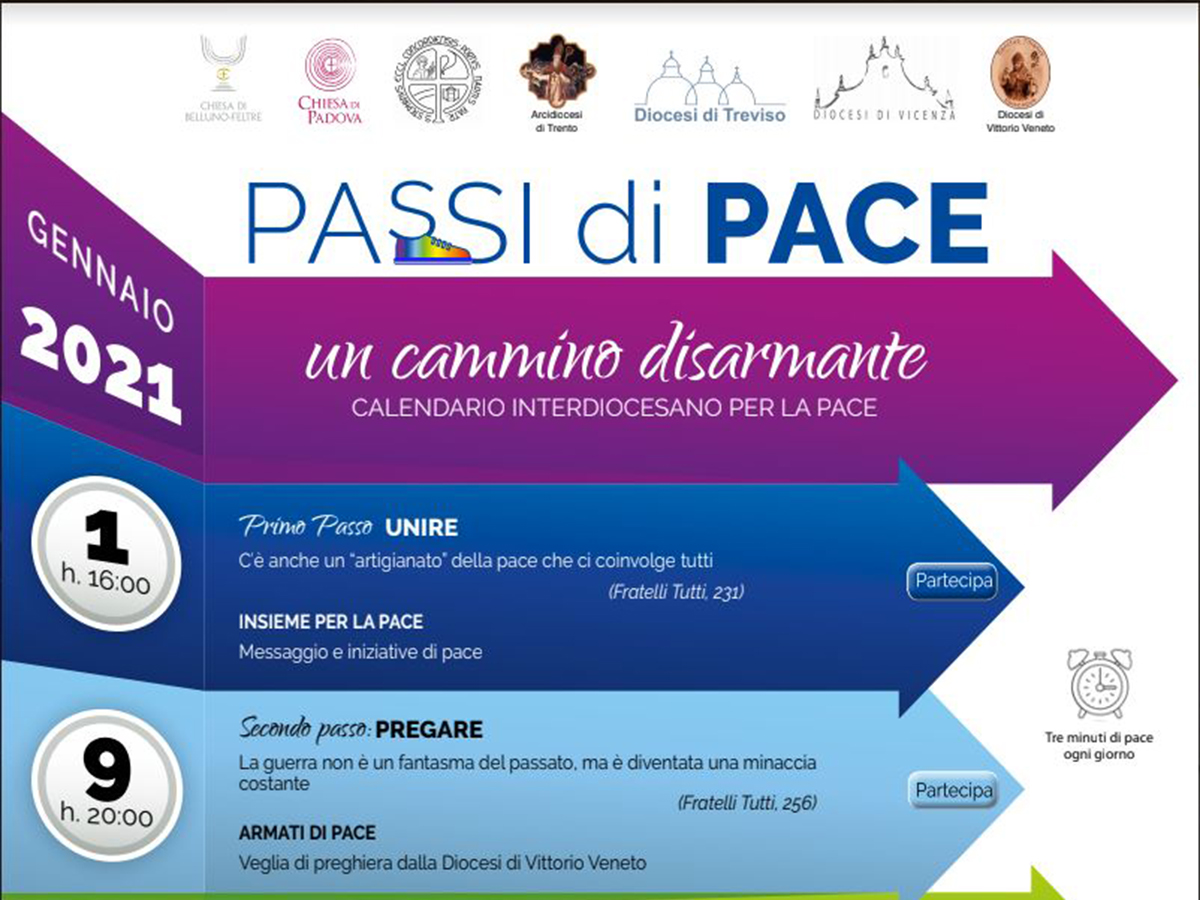 Causa Covid-19 non ci sarà la tradizionale Marcia per la pace a gennaio. Ma l’appuntamento è stato trasformato e amplificato. Se non si può marciare insieme, infatti, ciascuno può fare un passo di pace e in questo caso a farlo sono sette le Diocesi del Triveneto che scandiranno un “cammino disarmante” (come è stato chiamato il calendario interdiocesano per la pace 2021) in sei passi.