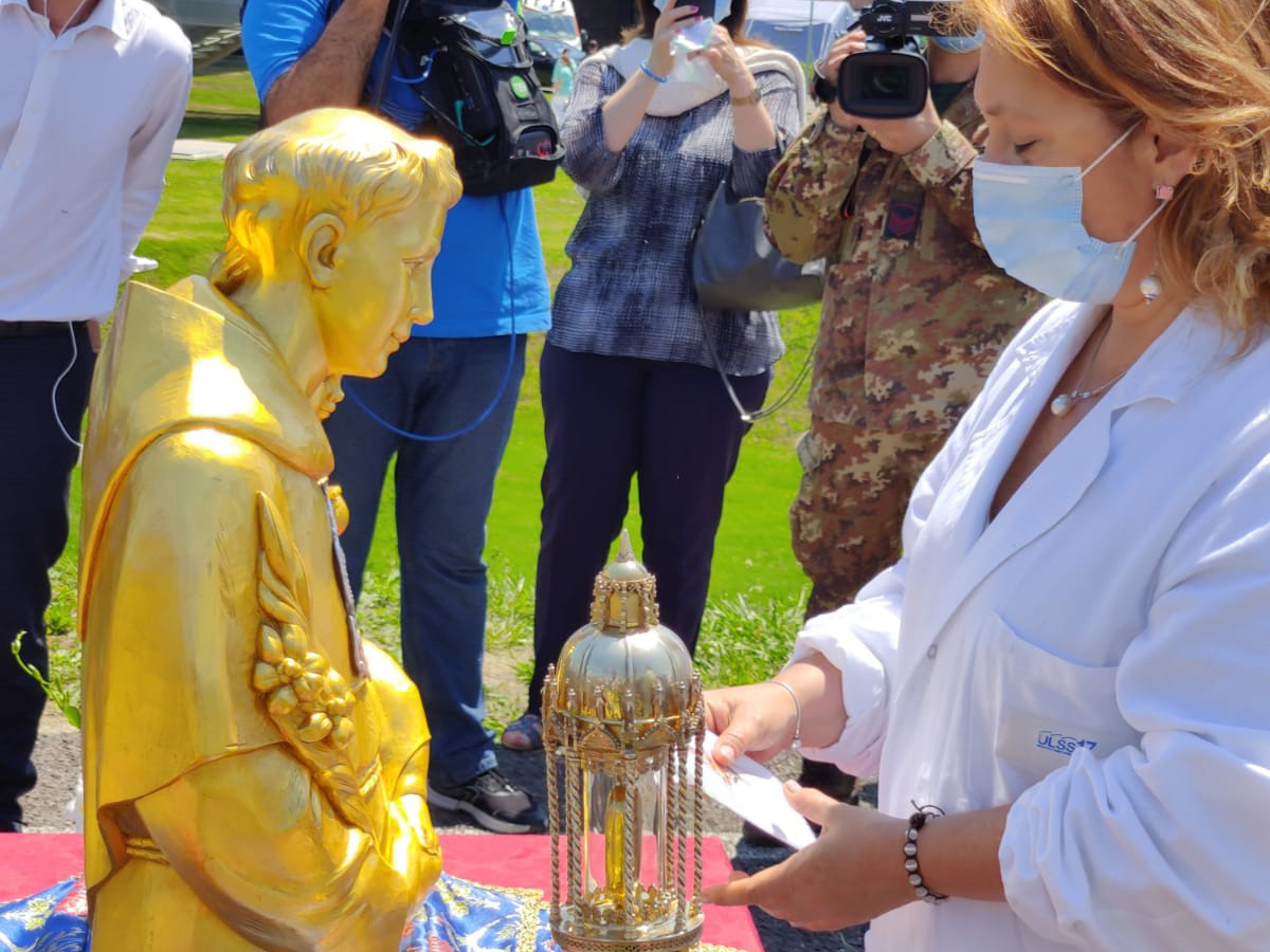 La Santa Reliquia è stata accolta da una trentina tra medici, infermieri, operatori sanitari, dirigenti, in rappresentanza di tutto il personale dell’Ulss 6 Euganea impegnato in questi mesi nel contrasto al Covid-19. Il DG Scibetta: “Grazie Sant’Antonio per essere con noi, grazie per essere sceso tra di noi, grazie per esserti fatto accanto alle nostre fragilità, alle nostre paure, alle nostre responsabilità, alla nostra speranza. Grazie per prenderti cura di noi”.Sottolineata l’importanza di fare “squadra”. Padre Svanera, rettore della Basilica antoniana: “Il Santo Taumaturgo non poteva non sostare qui, nel luogo dove le persone vivono nelle ferite della loro carne l’esperienza umana, che però ci permette di far diventare le ferite delle feritoie che aprono all’assoluto. Il volo in elicottero costringe a guardare in alto”.
