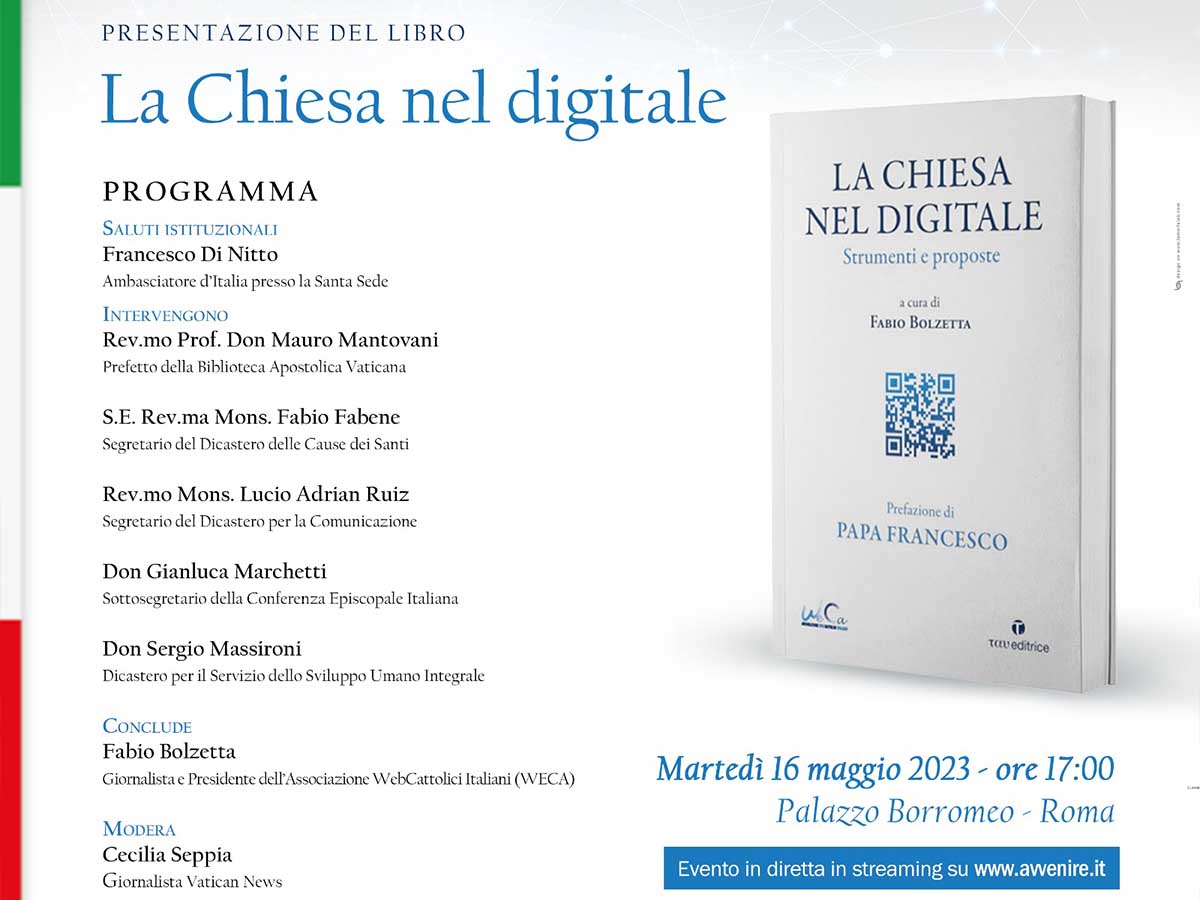 In occasione della LVII Giornata mondiale delle Comunicazioni Sociali, l’Ambasciata d’Italia presso la Santa Sede ha organizzato, martedì 16 maggio 2023 alle ore 17 a Palazzo Borromeo, sede dell’istituzione diplomatica, la presentazione del libro “La Chiesa nel digitale” (Tau editrice), curato da Fabio Bolzetta e promosso dall’Associazione dei WebCattolici Italiani (WECA) che, con l’occasione, celebrerà i venti anni di fondazione.