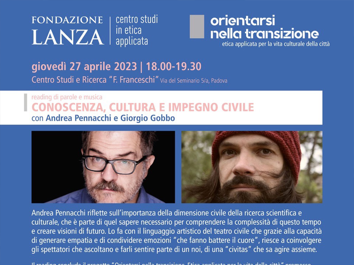 Un reading di parole e musiche concluderà il progetto ORIENTARSI NELLA TRANSIZIONE. Etica applicata per la vita della città promosso dalla Fondazione Lanza quale contributo per gli 800 anni dalla fondazione dell’Università di Padova