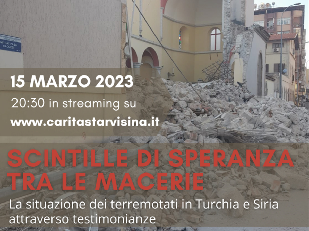 Mercoledì 15 marzo 2023, alle ore 20.30, le Caritas della delegazione Nord-Est (Friuli Venezia Giulia, Trentino Alto Adige e Veneto) organizzano l’incontro online Scintille di speranza tra le macerie, un momento di riflessione e testimonianza sulla situazione drammatica dei terremotati in Turchia e Siria.
