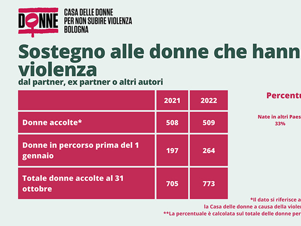 Dati 2022 della Casa delle donne per non subire violenza di Bologna sostanzialmente invariati, ma sono aumentati i fatti gravi che necessitano di maggior supporto. Altra novità, uno sportello all’interno dell’Università