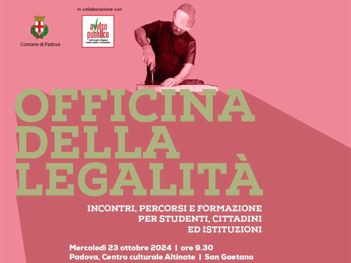 Il Comune di Padova e l’associazione Avviso Pubblico danno il via a "Officina della Legalità", un progetto dedicato alla promozione della cultura della legalità e della cittadinanza responsabile, rivolto a studenti, cittadini e istituzioni. Il primo incontro si terrà mercoledì 23 ottobre 2024, dalle 9:30 alle 12:30, presso il Centro Culturale Altinate/San Gaetano (Via Altinate 71), e rappresenta l'inizio di un percorso formativo articolato su più fronti, con l’obiettivo di rafforzare la democrazia locale.