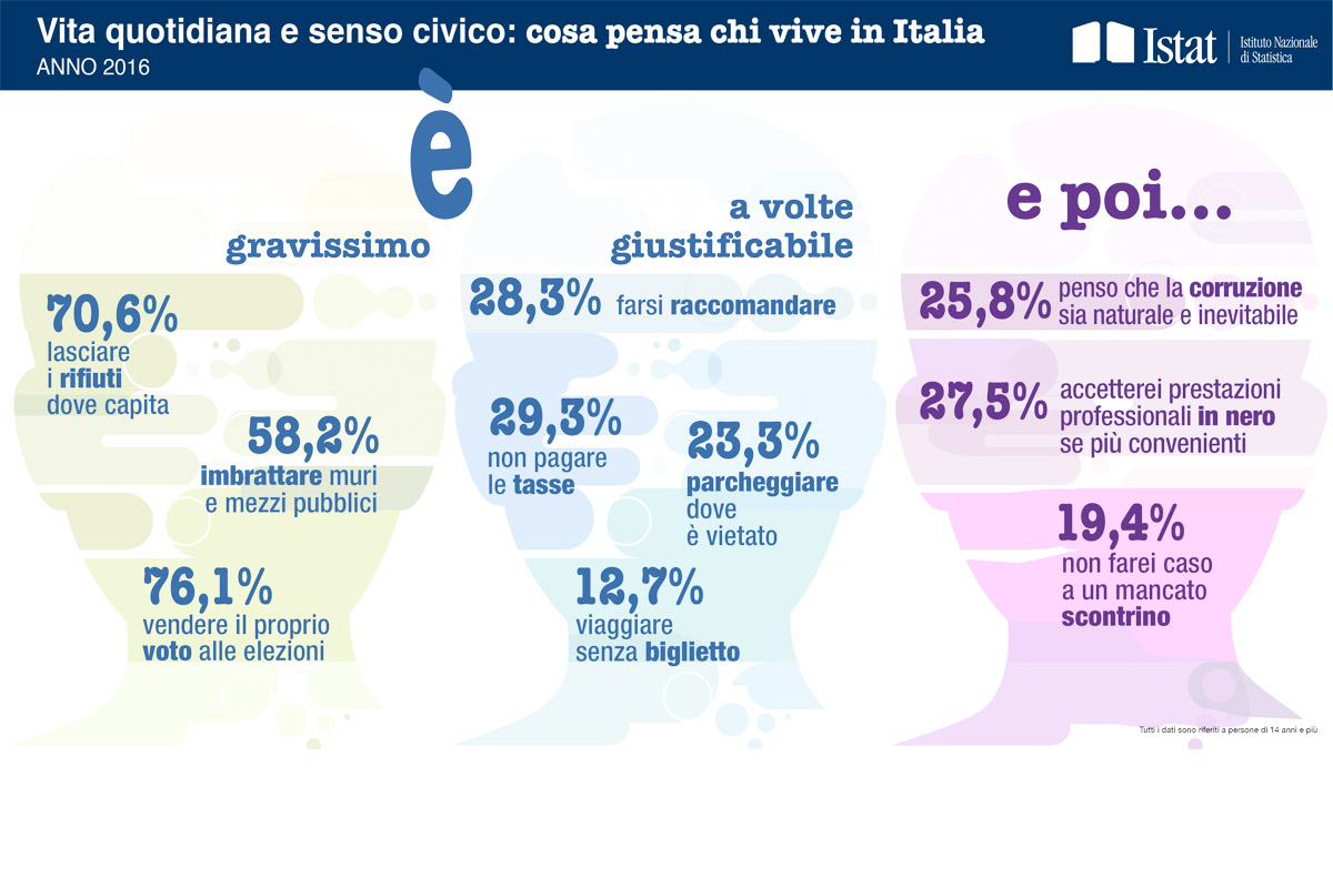In Italia, un quarto degli over 14 considera la corruzione un fatto naturale e inevitabile (il 25,8 per cento si dichiara molto o abbastanza d’accordo con tale affermazione); sei persone su dieci ritengono pericoloso denunciare fatti di corruzione e oltre un terzo (36,1 per cento) lo ritiene inutile. È quanto emerge dal report su “Senso civico: atteggiamenti e comportamenti dei cittadini nella vita quotidiana” diffuso il 20 marzo dall’Istat.