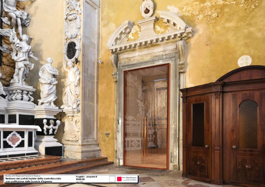 Le attuali bussole d’ingresso del 1958 con struttura lignea in abete, in scadenti condizioni di conservazione, erano ritenute incongrue sia per l’effettivo utilizzo sia perché ostacolavano la visibilità dei portali e degli altari laterali. Serviva tuttavia un manufatto con funzione di filtro per evitare l’ingresso in chiesa sia dei rumori della piazza sia delle polveri provenienti, e che mitigasse le temperature delle varie stagioni climatiche. Le nuove porte saranno fissate a una nuova imbotte, in acciaio brunito, e saranno costituite da due ante in vetro temperato.