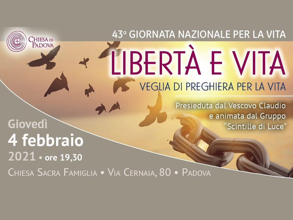 “Libertà e vita” è il titolo del messaggio che il consiglio episcopale della Cei ha preparato per la 43a Giornata nazionale per la vita che si celebra domenica 7 febbraio. A Padova è in programma – giovedì 4 alle 19.30 nella chiesa di Sacra Famiglia – una veglia presieduta dal vescovo Claudio.