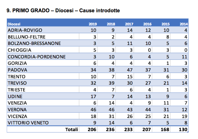 I dati vengono resi noti, come di consueto, nell’ambito dell’inaugurazione dell’anno giudiziario del Tribunale Ecclesiastico Regionale Triveneto (Tert), che si tiene giovedì 20 presso il centro Card. Urbani di Zelarino, alla presenza del Patriarca mons. Francesco Moraglia e con la relazione del prof. Manuel Arroba Conde, attualmente giudice della Rota spagnola e Direttore della sezione di Madrid dell’Istituto Giovanni Paolo II.La prima considerazione da fare, dunque, è che oggi sono molto più numerose rispetto a un tempo le persone che prendono in considerazione l’opportunità di ottenere la nullità matrimoniale. <Solitamente – commenta il vicario giudiziale don Adolfo Zambon – le persone prendono in considerazione la possibilità di rivolgersi al Tribunale ecclesiastico su consiglio di qualche sacerdote, oppure perché stanno vivendo un contesto di di accompagnamento pastorale>. Fondamentale, dunque, il ruolo di chi – sacerdote o laico – si trovi ad accompagnare spiritualmente una persona che abbia vissuto, recentemente o meno, la dolorosa esperienza della separazione o del divorzio. <E’ questa una possibilità da tenere sempre più presente>, sottolinea appunto il vicario giudiziale. Tornando ai dati, l’aumento di cause introdotte negli ultimi anni ha fatto sì che rimangano pendenti, da un anno all’altro, numerose istanze: erano 532 a inizio 2019, siamo saliti a 546 a fine anno. E questo nonostante un irrobustimento della struttura del Tribunale, nelle diverse sedi diocesane, che ha portato a esaminare, nel solo anno 2019, ben 738 cause di prima istanza.L’attività istruttoria è molto efficace e il “filtro” posto a monte fa sì che il 90% delle cause sfoci in una sentenza affermativa, cioè conduca alla nullità matrimoniale: delle 187 cause terminate lo scorso anno, con il processo ordinario, ben 167 hanno avuto sentenza affermativa. A queste poi si devono aggiungere le istanze che hanno seguito l’iter del “processo breve”, ugualmente introdotto da Papa Francesco qualora si determinino alcune precise condizioni: in questo caso il procedimento di nullità viene seguito direttamente dal vescovo (è questo il tema trattato giovedì all’inaugurazione dell’anno giudiziario dal prof. Conde). Il numero è ancora esiguo (5 terminate nel 2019), ma si tratta di una possibilità che va considerata con molta attenzione. Una delle condizioni è che le due parti siano entrambe d’accordo e poi che vi sia una manifesta nullità: <Questo significa – sottolinea don Zambon – che le persone, terminata l’esperienza di vita coniugale, riescono a compiere un passo avanti sulla via della carità, superando le tensioni e le divisioni, rileggendo in modo sereno la propria vicenda coniugale>. Per quanto riguarda i “capi di nullità” nelle cause terminate nel 2019, ovvero le motivazioni che hanno determinato la sentenza favorevole, prevale il “grave difetto di giudizio circa i diritti e i doveri essenziali del matrimonio”, seguito dalla “incapacità di assumere le obbligazioni essenziali del matrimonio”, dalla “esclusione dell’indissolubilità del vincolo” e dalla “esclusione della prole”.Un aspetto poco noto relativo alle cause di nullità matrimoniale riguarda il coinvolgimento di un numero cospicuo di persone. Si pensi che nel corso della fase istruttoria delle 192 cause terminate nel 2019 sono state ascoltate circa 1100 persone, tra le parti in causa e i testimoni. <Pur in un contesto che è quello tipico del procedimento canonico – sottolinea il vicario giudiziale – è questa una occasione propizia, per queste persone, per riflettere su alcuni aspetti del matrimonio o su altri fondamentali nella propria vita. Alcune persone, riporto solo la mia esperienza personale – prosegue don Zambon – hanno affermato di aver scoperto solo in questa occasione alcuni aspetti fondamentali del matrimonio cristiano>. Serena Spinazzi Lucchesi