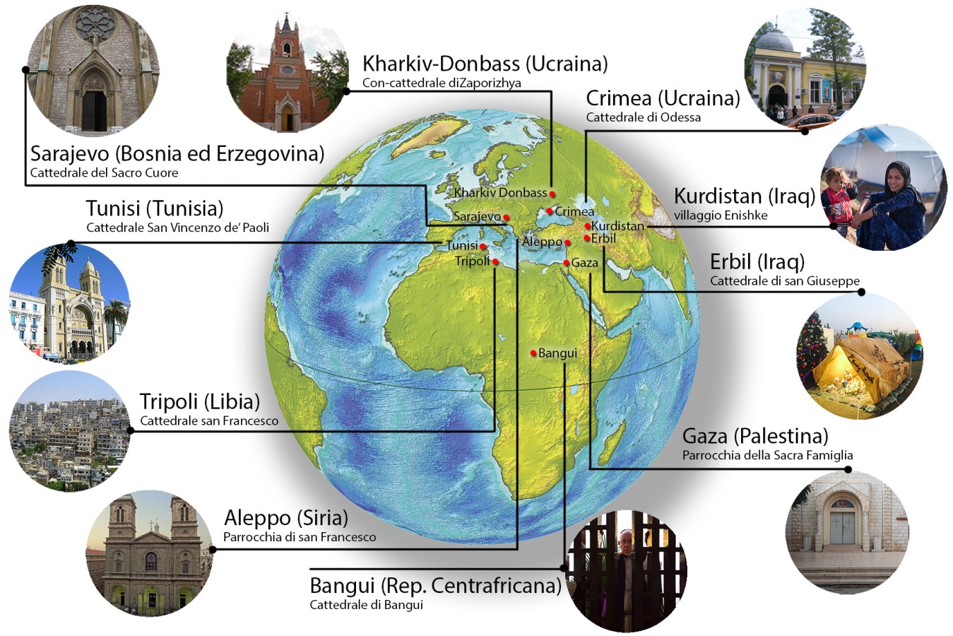 Le parole di Papa Francesco, all'apertura della Porta Santa a Bangui, nella Repubblica Centrafricana, portano all'attenzione dell'opinione pubblica mondiale quei Paesi che stanno passando attraverso la croce della guerra, come la Siria, la Libia e l'Iraq, e altri che ne vivono le ferite ancora aperte come a Gaza, a Sarajevo, in Ucraina e in Crimea. Anche in questi luoghi verranno aperte le Porte Sante della Misericordia. Porte di cattedrali colpite, distrutte, che hanno ritrovato un valore anche dentro le pareti strette di un tendone. Per loro il Papa chiede "pace, misericordia, riconciliazione, perdono, amore".