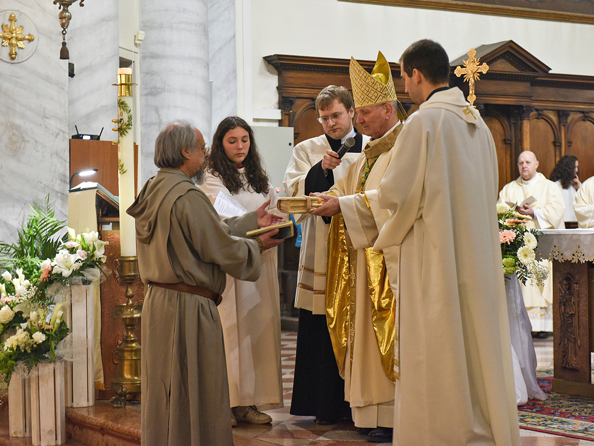 A Quero, martedì 23 aprile, fratel Gianmartino Maria Durighello ha emesso la professione eremitica temporanea nelle mani del vescovo Claudio. La celebrazione eucaristica presieduta dal vescovo Claudio è stata vissuta dall’assemblea e dai numerosi presbiteri presenti con viva partecipazione e commozione. La coralità del canto e le toccanti parole della professione – «… presento l’offerta piena della mia vita al Signore confidando nel suo amore fedele e affidandomi alla beata Maria, a santa Maria Maddalena e ai nostri santi patroni Prosdocimo e Giustina» – hanno dato la possibilità a ognuno di sentirsi coinvolto nel rito. Il vescovo Claudio, nell’omelia, ha esordito osservando «come non era tanto importante “dire” delle parole, ma lasciar parlare il rito e ascoltare la Parola del Vangelo che ci offre l’incontro dei discepoli di Emmaus con il Signore risorto. Il loro occhi erano incapaci di riconoscere Gesù e il loro volto era triste. Anche noi possiamo vivere questa situazione, possiamo avere delle tristezze, delle paure, dei traumi. E dobbiamo metterli davanti a Gesù, nella mensa della Parola e dell’eucaristia. Dopo che Gesù spezza il pane della Parola e il pane del suo Corpo essi aprirono i loro occhi e lo riconobbero». Ancora il vescovo ha sottolineato come «la vocazione eremitica è in un certo modo propria di ognuno di noi. Ognuno di noi deve avere un eremo del cuore, una stanza dove incontrare Gesù, far sparire i propri traumi alla mensa della sua Parola e del suo corpo. Ognuno di noi può e deve scendere nella stanza, nell’eremo del proprio cuore e incontrare Gesù che cammina con noi». Fratel Gianmartino Maria Durighello si aggiunge ai quattro eremiti, di cui due sacerdoti, e alle tre eremite presenti nella nostra Chiesa di Padova. Essi “supportano” la nostra Diocesi soprattutto con la preghiera, ma anche con alcuni servizi specifici come la disponibilità per i dialoghi spirituali, le confessioni, il ministero dell’esorcismo, la lectio divina, la cura della liturgia e l’aiuto al vescovo. Questi servizi però non esauriscono la vocazione eremitica la quale è una forma di vita conforme a Cristo, riconosciuta da sempre dalla Chiesa e riconducibile all’esperienza di Gesù solitario sul monte: silenzio, preghiera e solitudine – cioè “soli con il Solo” – sono i tratti che caratterizzano l’eremita diocesano. Pur restituendoci questo tratto specifico della forma di vita del Cristo, l’eremita diocesano «è una figura in aperta relazione con il corpo ecclesiale e il corpo della storia». Il Dicastero per gli Istituti di vita consacrata e le società di vita apostolica, nel documento La forma di vita eremitica nella Chiesa particolare aiuta a capire il valore della vocazione eremitica: «Chiesa e mondo sono la cornice che preserva l’eremita dalla soggettività individualistica e lo pone come sentinella di speranza che avanza sulle strade del tempo con lo sguardo fisso alla futura ricapitolazione di tutto in Cristo, consapevole che tempo ed eternità non sono più l’uno dopo l’altra, ma intimamente connessi».