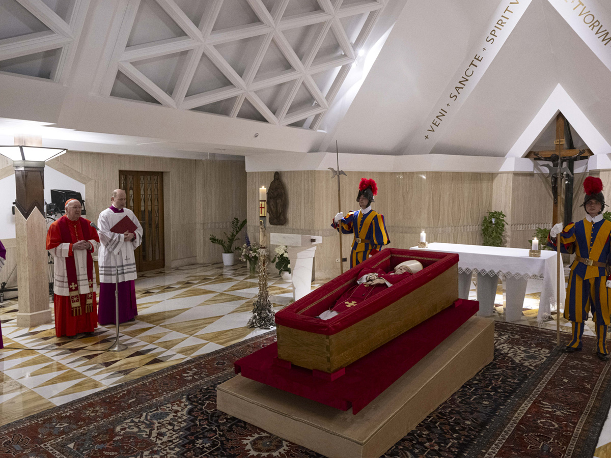 Prime immagini del corpo di Papa Francesco nella bara di cipresso, dopo il rito di constatazione della morte a Casa Santa Marta. Domani la traslazione alla basilica di San Pietro e sabato 26 aprile la Messa esequiale sul sagrato. Al termine, la sepoltura a Santa Maria Maggiore, secondo le volontà del Pontefice.