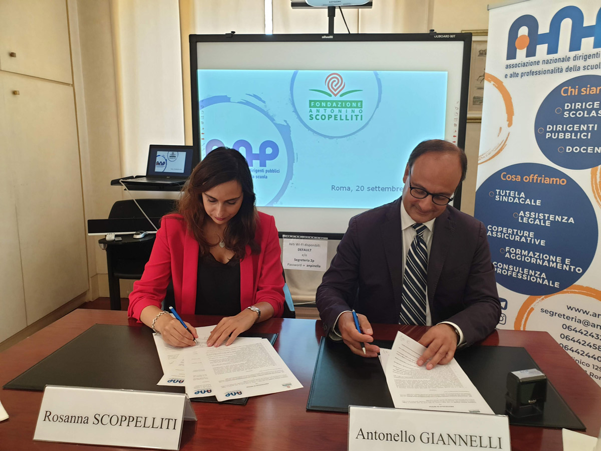 Firmato il 20 settembre, nelle sede romana di Anp, un accordo con la Fondazione Antonino Scopelliti – ente no profit antimafia attivo nella tutela delle fasce deboli – per portare la legalità nelle scuole con un'azione ramificata che coinvolgerà gli istituti di tutta Italia. La prima iniziativa congiunta sarà un bando nazionale per una borsa di studio intitolata alla memoria di Antonino Scopelliti.